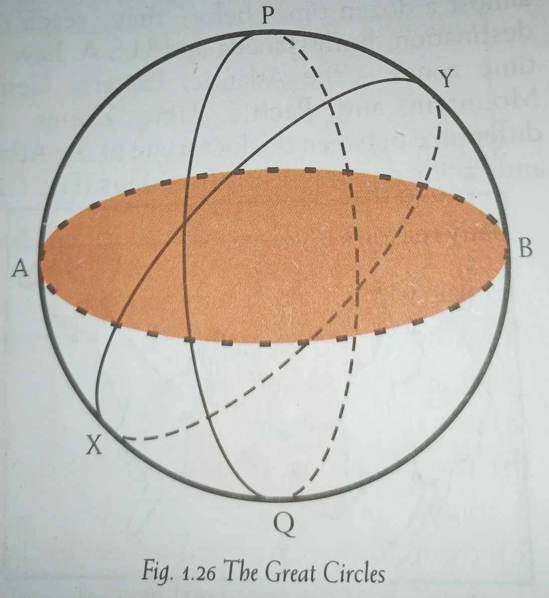 There are an infinite number of great circles of equal length running around the globe, e.g. the circle formed by the Greenwich Meridian and the 180° meridian (PQ); the circle formed by the 130°W and 50°E meridians (XY).