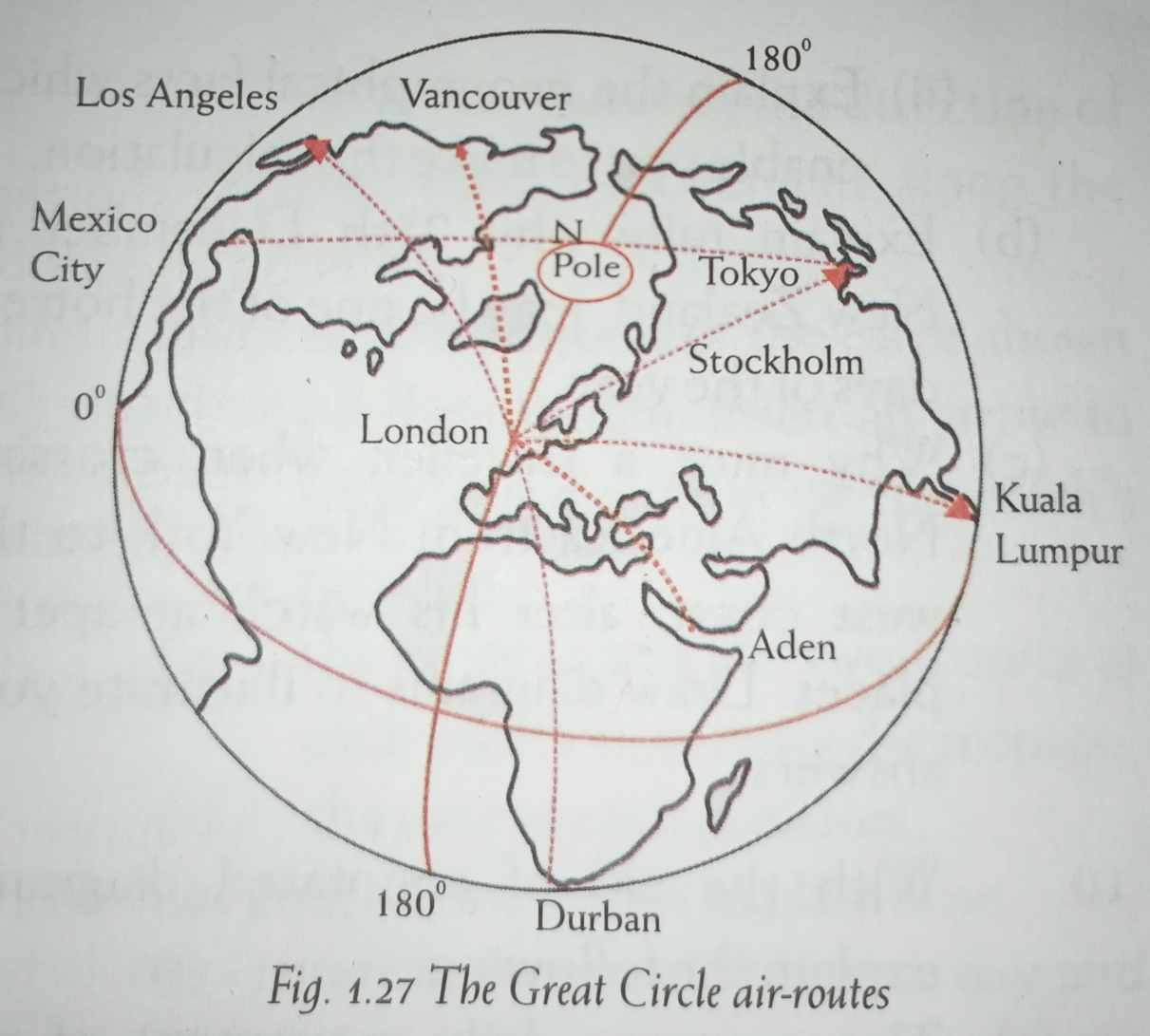 Firstly, air routes must link numerous cities and thus planes proceed in short ‘hops’ from place to place; secondly, it may be impossible to fly along great circles for political reasons, if some countries forbid the use of their air-space; thirdly, air routes tend to follow the land in case of accident and rarely fly for long distances over the sea. However, where long distances have to be covered over uninhabited regions, great circle routes are the quickest. They are therefore used in crossing polar regions.