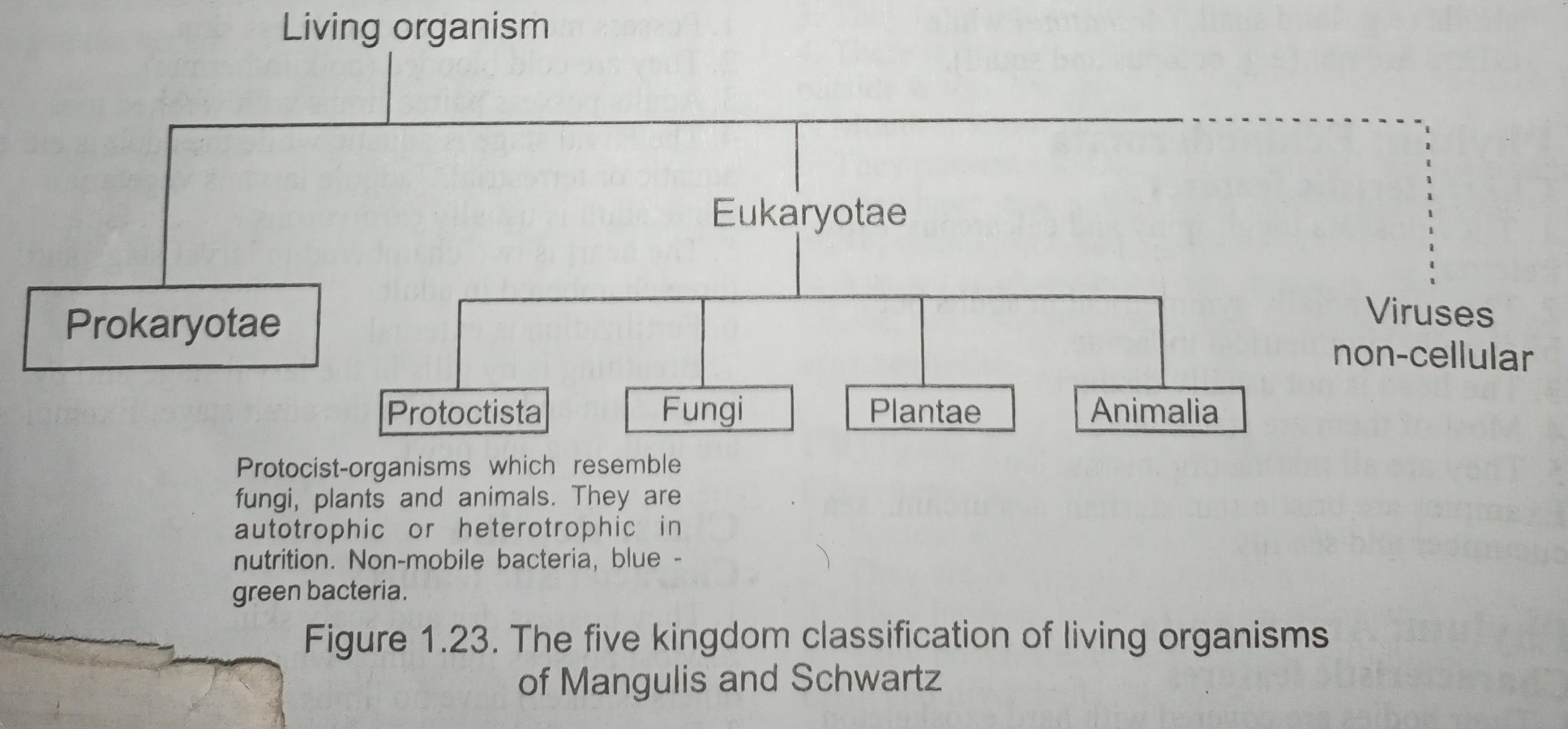 The new system of classification was introduced by Margulis and Schwartz in 1982. All cellular organisms fall into groups namely Prokaryote and Eukaryotae. These two groups have their DNA located in different areas of their cells. The DNA of prokaryote (Pro=before; karyon=nucleus) is not enclosed by nuclear membranes and float freely in the cytoplasm. The cells of prokaryote have no true nuclei. The DNA of eukaryotes (eu=true) are enclosed with nuclear membranes and located in nucleus. Based on the cellular organization and structural similarities, Schwartz recognised five kingdoms namely: Prokaryote (prokaryotes), Protoctista (protoctists), Fungi, Plantae and Animalia. Of the five kingdoms, four kingdoms are classified as follows: Protoctista, Fungi, Plantae and Animalia and placed under Eucaryotae because their DNA is located in nucleus and enclosed with nuclear membranes. This classification places Prokaryote as a king-dom having no regard to the fact that all organisms fall into two distinct groups namely Prokaryote and Eukaryotae.