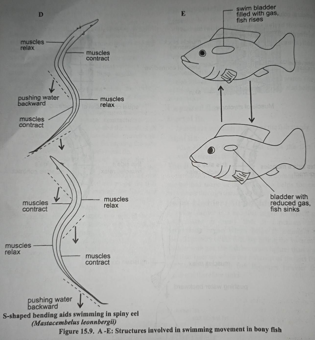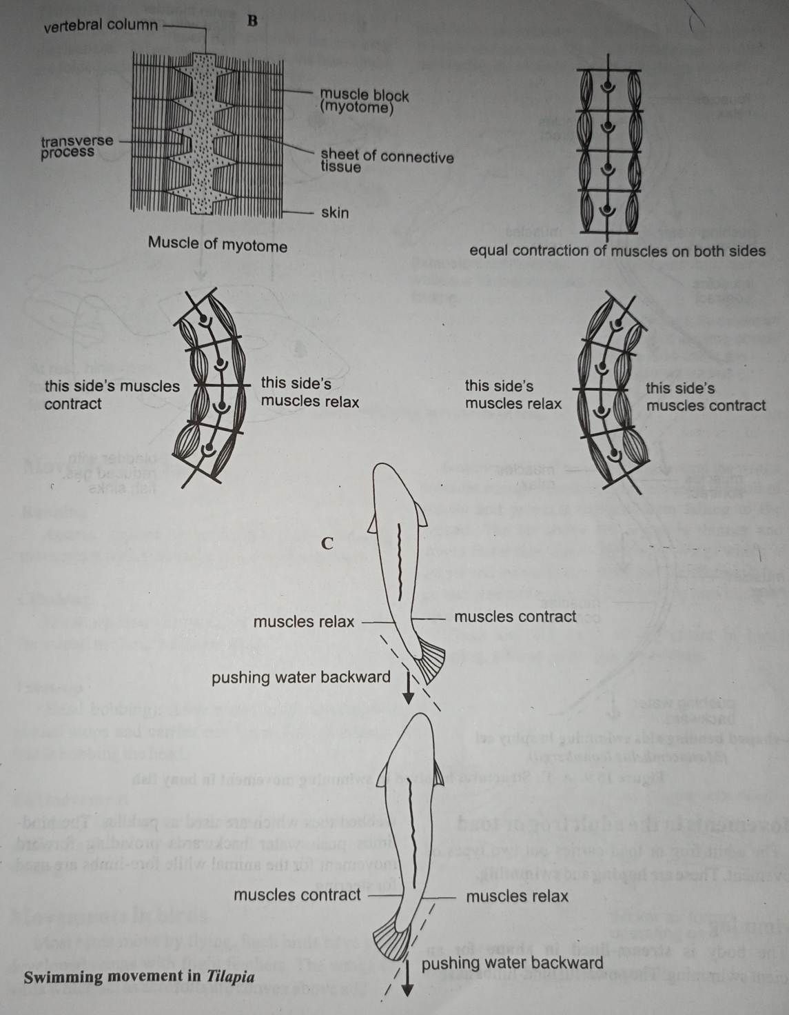 Swimming is brought about when the muscle blocks of one side contract bending the flexible vertebral column and at the same time the muscle blocks of the other side relax resulting in the bending of the body. The alternate contractions and relaxations of the muscle blocks and the bending of the vertebral column create wave-like movements that run from head to the caudal fin causing the side to side (lateral) movements of the caudal fin.