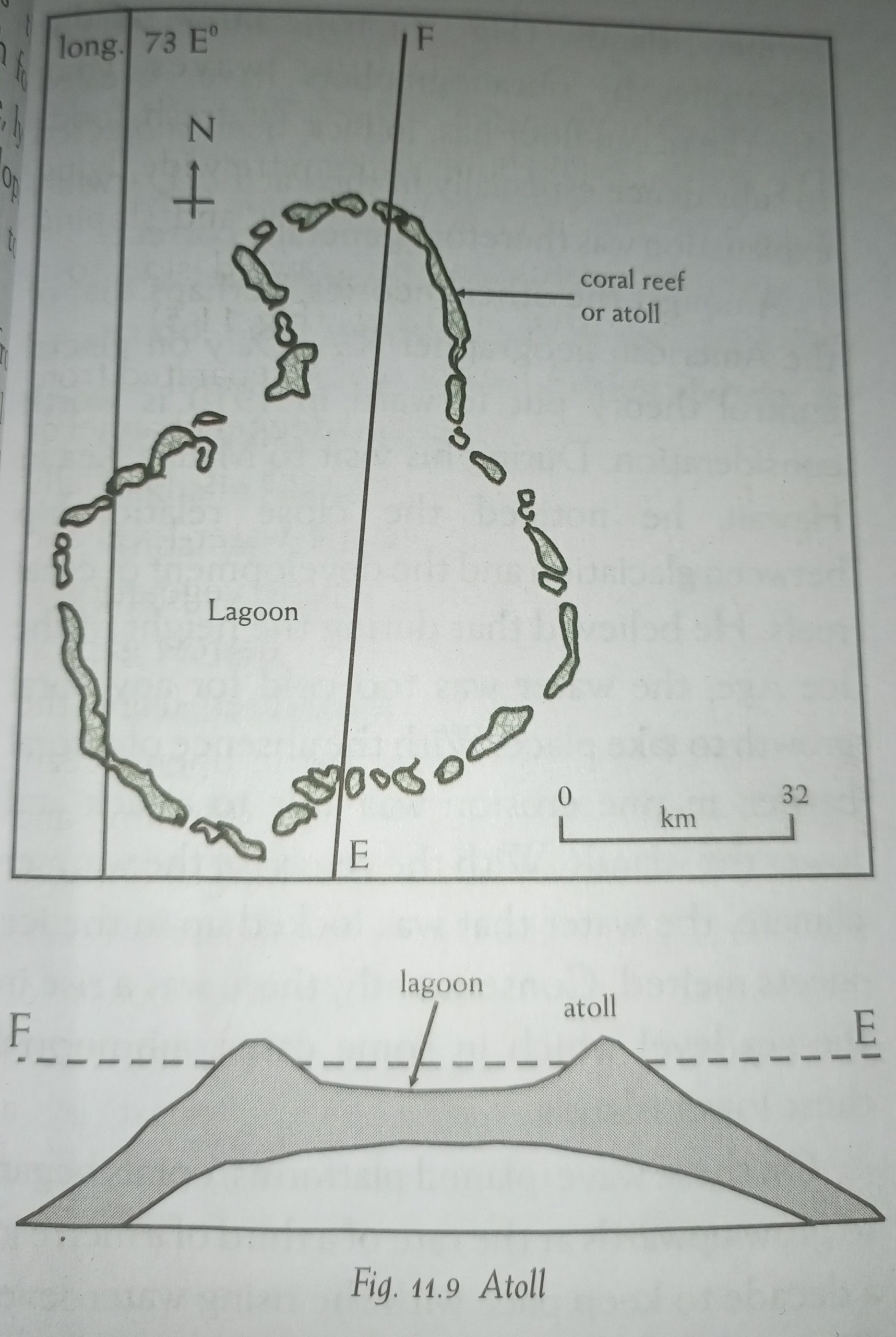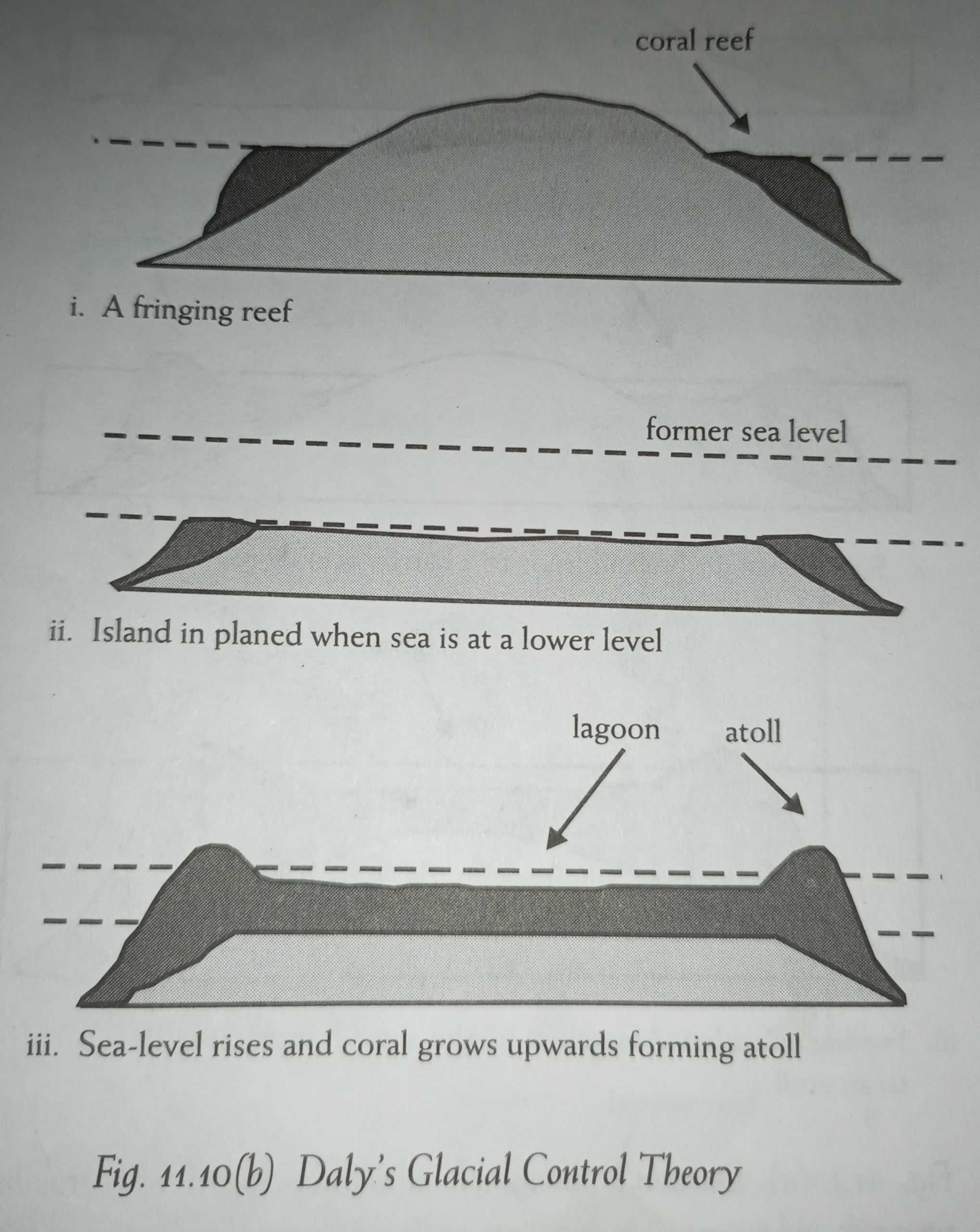 Due to a general downwarping of the earth’s crust, the islands gradually subsided. The corals continued to grow upwards to keep pace with the subsidence. The growth was more vigorous at the outward edge than the landward edge because of the more favourable living conditions for corals, so the encircling reef widened. It then formed a barrier reef, with a lagoon between the island and the reef. Eventually, when the land completely submerged, only the outer rims of the reefs were seen, forming an atoll. The submerged island was covered by a layer of sediment so that the characteristic circular lagoon is generally shallow. Thus atolls mark the position of the former islands (Fig. 11.10).