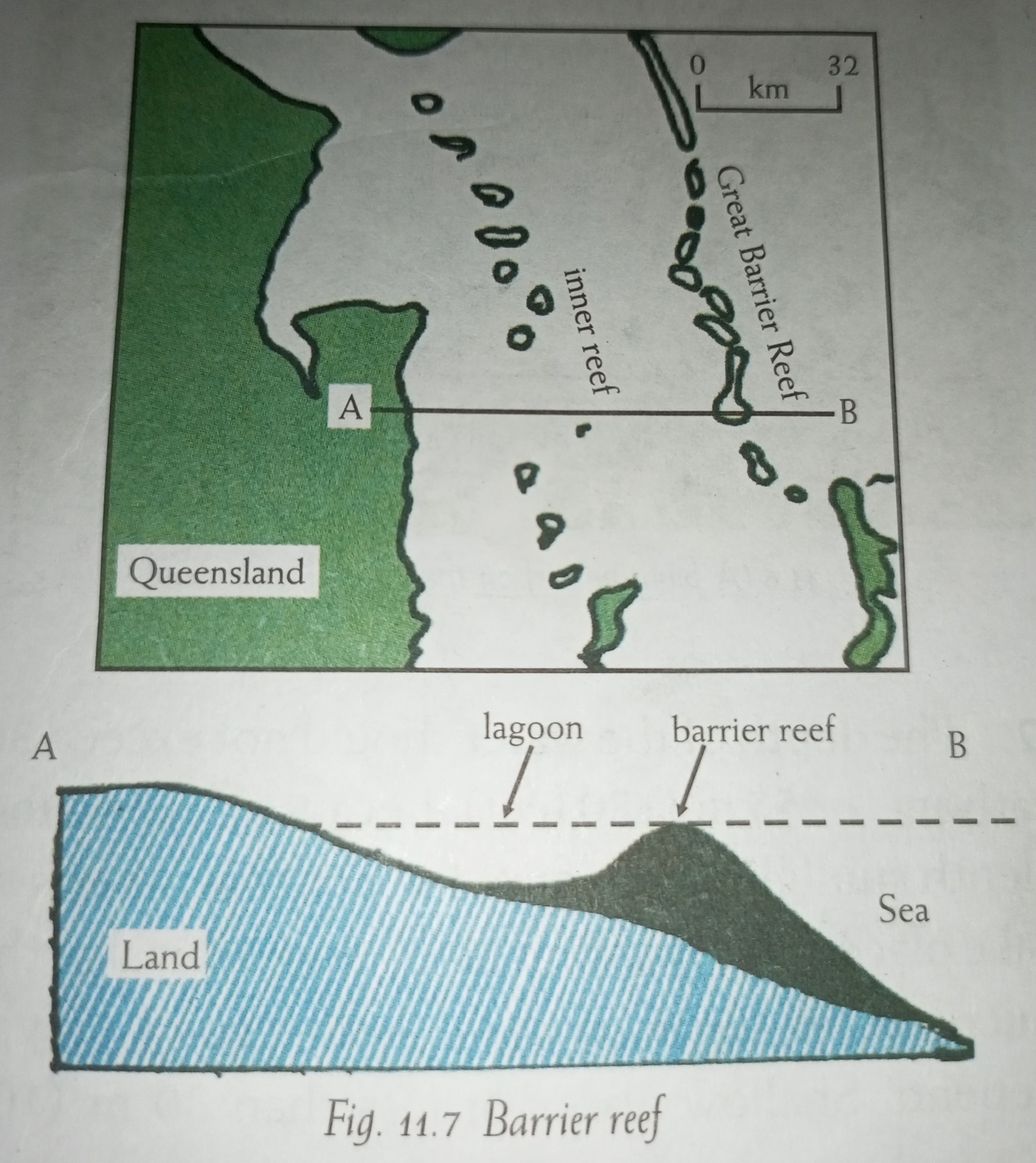2) Barrier reefs: A barrier reef is separated from the coast by a much wider and deeper channel or lagoon (Fig. 11.7).