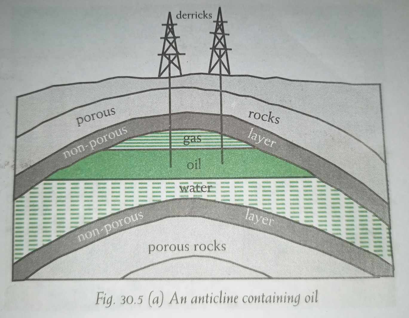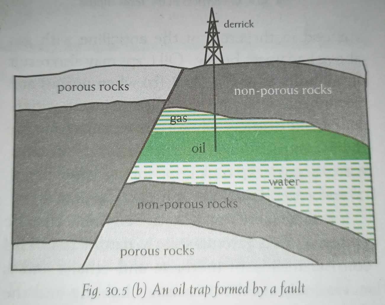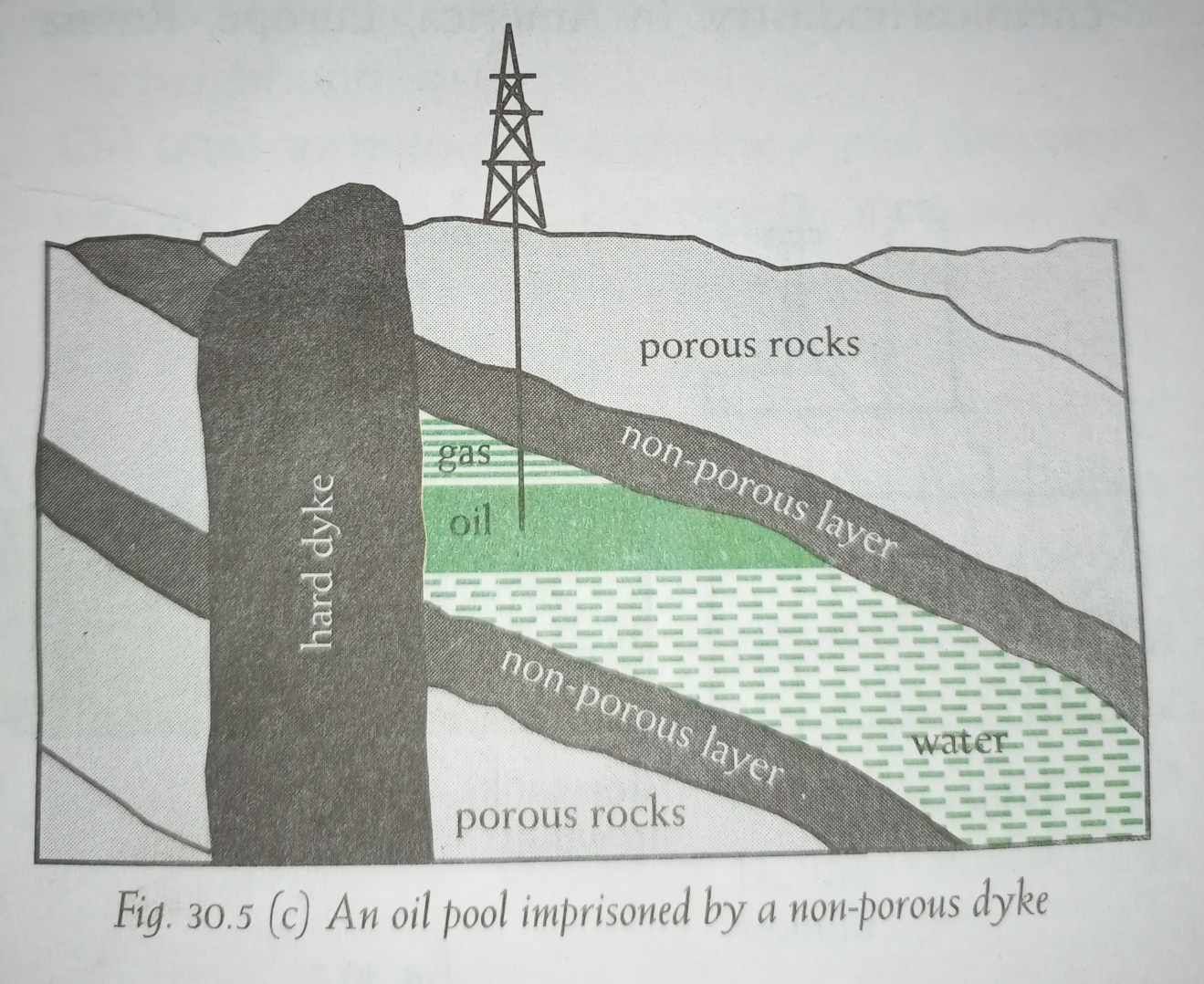 The oil is usually trapped in the crest of the anticiline with gas above and water below. Oil traps may also result from faults when porous and non-porous strata are brought into juxtaposition. In volcanic districts, when a resistant impermeable dyke is intruded into alternating layers of rocks, it may act as a cap rock imprisoning a pool of gas, oil and water.
