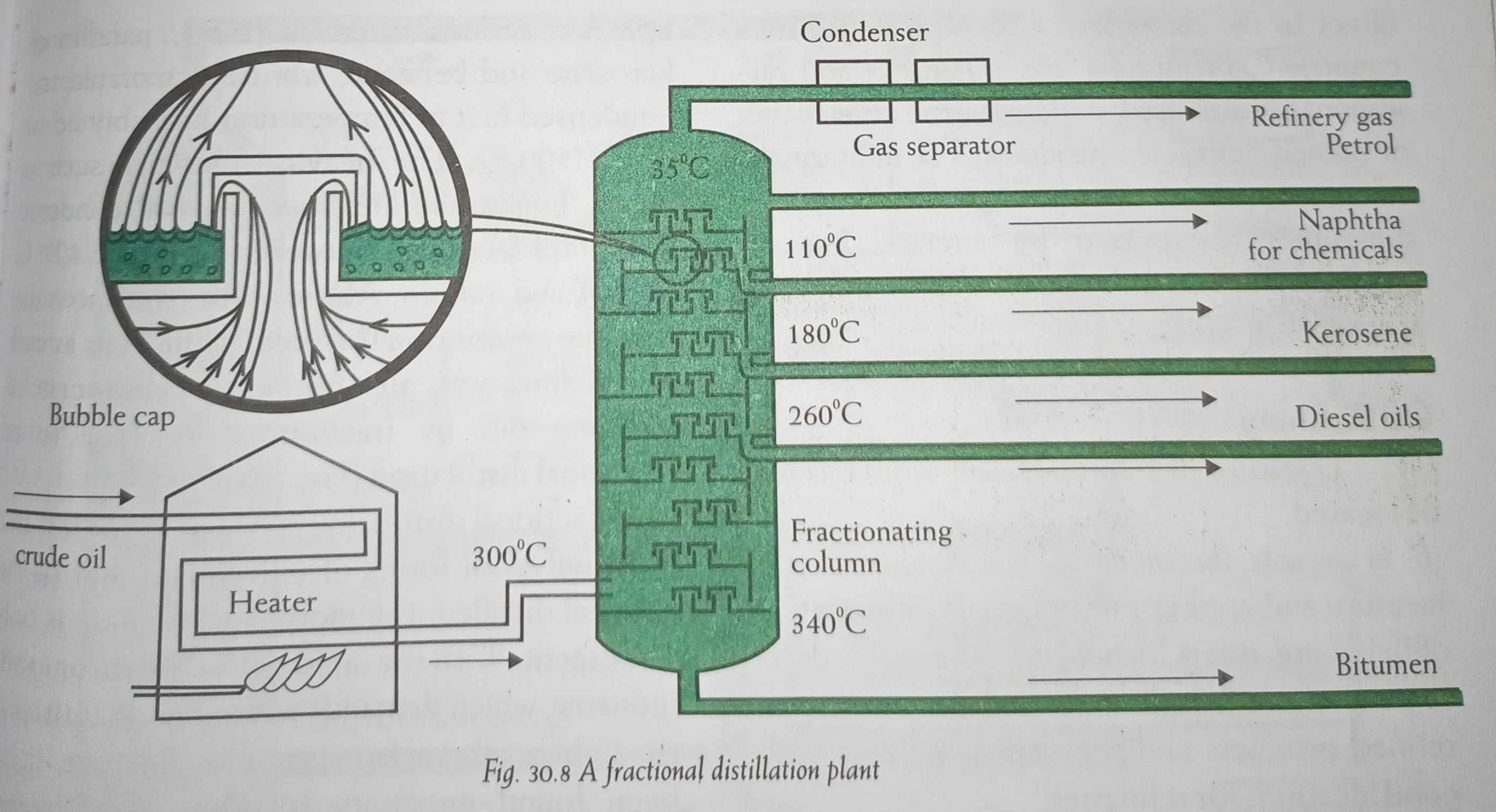 In distillation, the mechanism is simply to split the oil into its various ‘group’ of hydrocarbons or ‘fractions’ at a very high temperature. As each fraction boils at a different temperature, the various groups of hydrocarbons can be extracted at their own boiling points. The lighter fractions, such as petrol, paraffin or kerosene and benzene, will be evaporated and condensed first at temperatures probably below 38° C (100° F). The heavier fractions, such as diesel, lubricating and fuel oils, will condense later at temperatures between 38° C and 427° C (100° F.and 800° F). At the end of the line is the residue, comprising the heaviest fuel oils as well as vaseline, wax and asphalt. The process of distilling oils by fractions is referred to as fractional distillation.