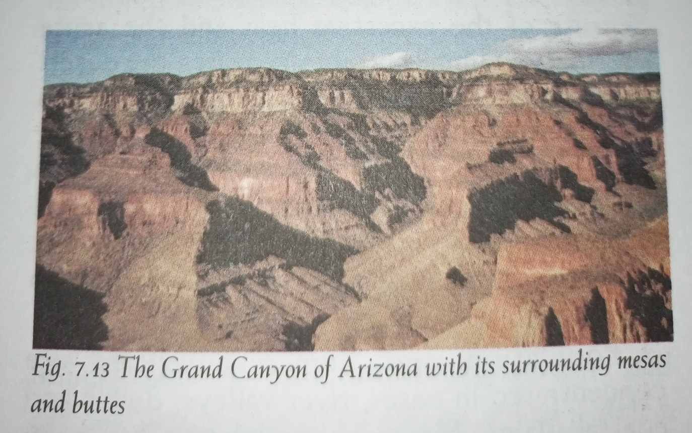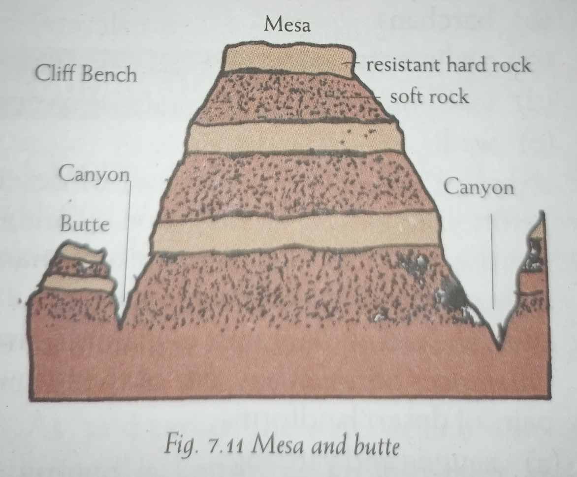 3) Mesas and Inselbergs: Mesa is a Spanish word meaning table. It is a landform with a flat, table-like cap of duricrust (laterite or calcrete) and very steep sides. The resistant cap may be broken into boulders as a result of seepage erosion, this could reduce the size of a mesa and a smaller landform termed a butte is formed. The steep sides of a mesa may consist of duricrust boulders which are remnants of the broken resistant cap transported from the top to the sides. Mesas are common features of the savanna and desert landscapes; for example, in the Jos Plateau and Northern-western parts of Kano State where they form residual hills on the basement complex (igneous and metamorphic rocks) plains.