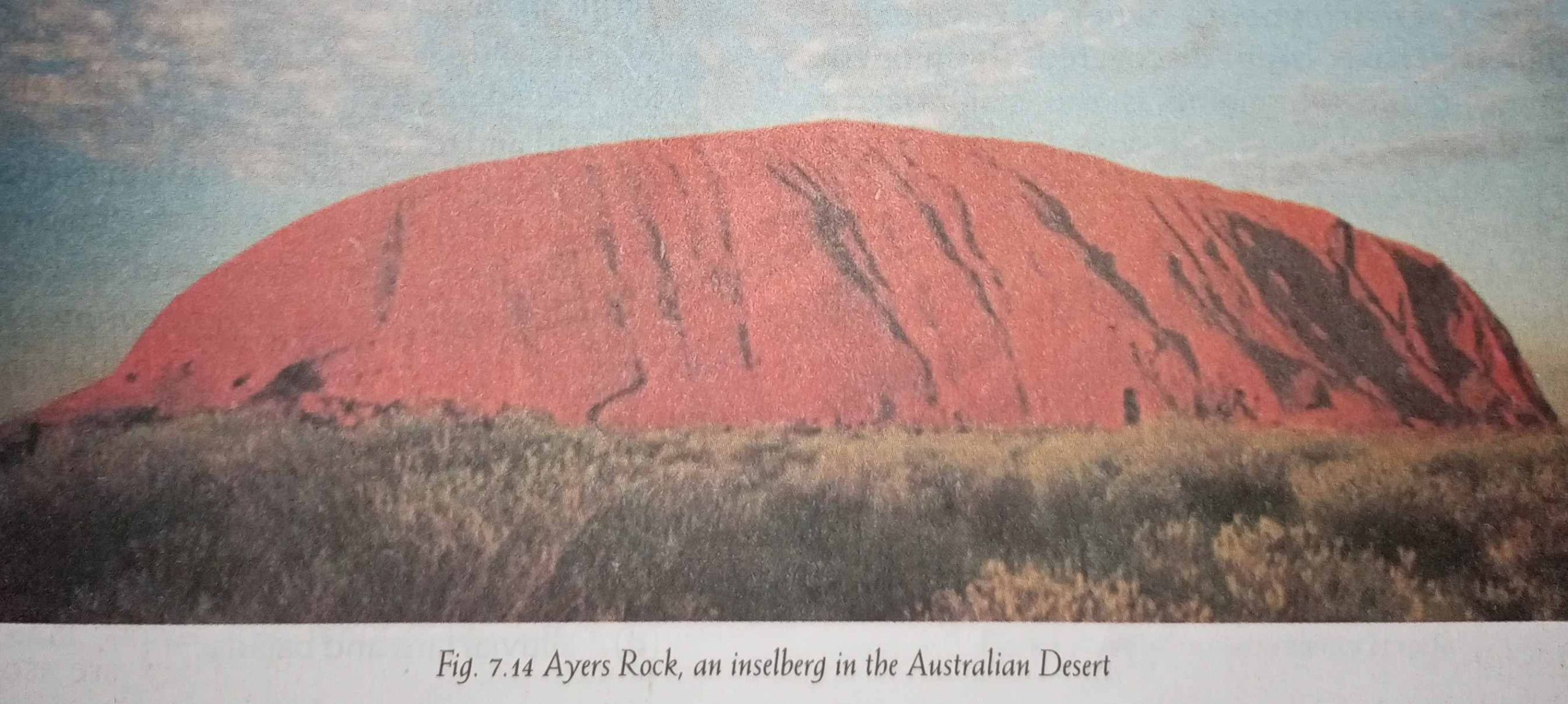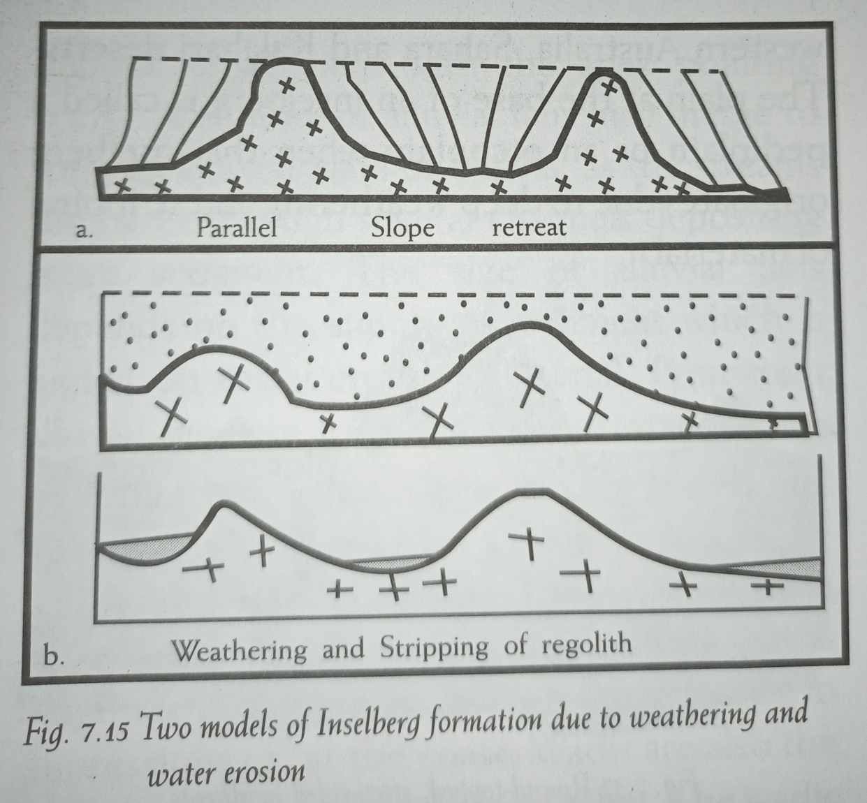 Two models illustrated in Fig. 7.15 are suggested to explain the origin of inselbergs. The first theory explains the origin of inselbergs by stream erosion and the retreat of slopes to form residual hills. The second theory attributes the formation of an inselberg of deep weathered regolith, leaving behind isolated hills. Inselbergs are typical of savanna and desert landscapes e.g. those of northern Nigeria, western Australia, Sahara and Kalahari deserts. The plain at the base of an inselberg is called a pediplain or an etchplain when the inselberg originates due to deep weathering and stripping of material.