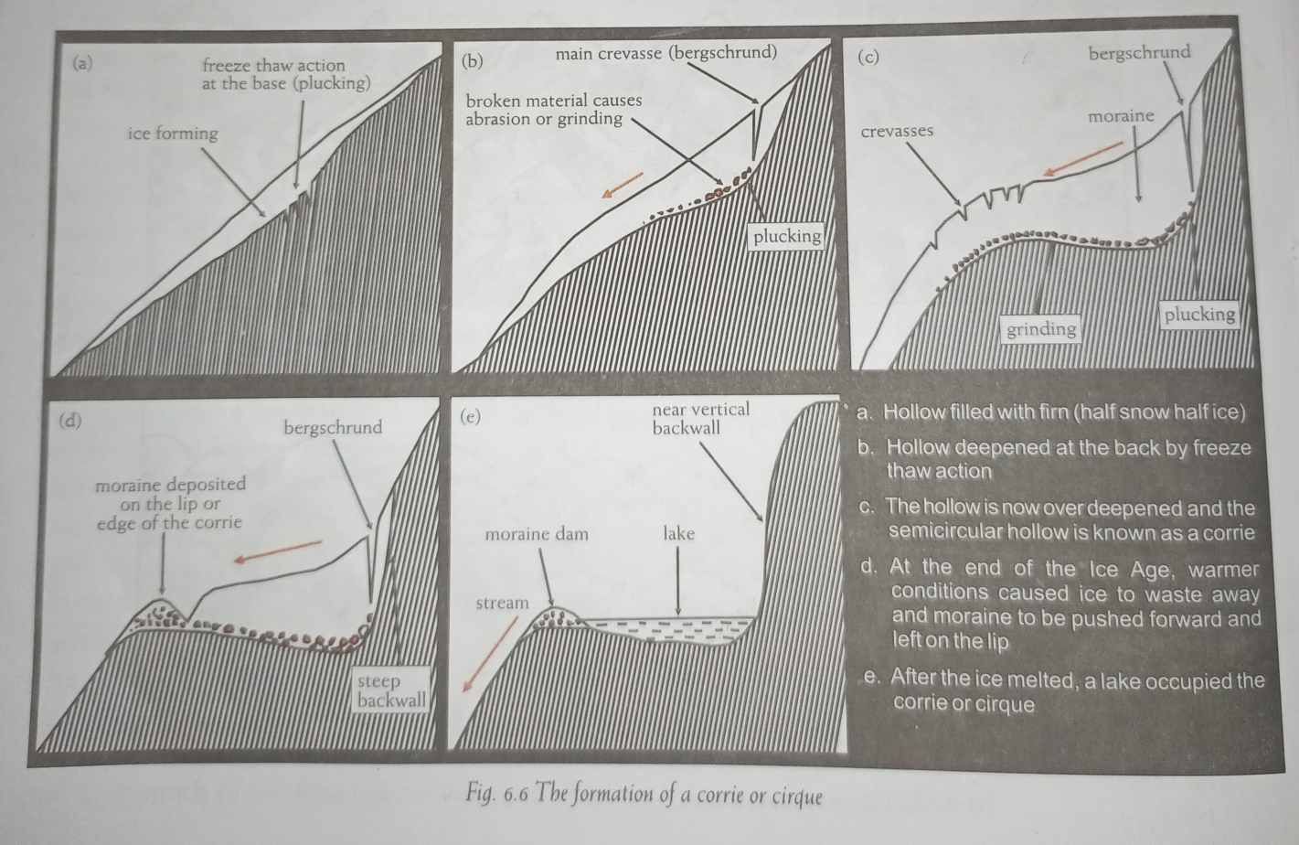 1) Corrie, cirque or cwm: The downslope movement of a glacier from its snow-covered valley-head, and the intensive shattering of the upland slopes, tend to produce a depression where the firn or neve accumulates. The process of plucking operates on the back wall, steepening it and the movement of the ice abrades the floor, deepening the depression into a steep, horse-shoe-shaped basin called a cirque (in French). It is also known as a corrie in Scotland and a cwm in Wales.