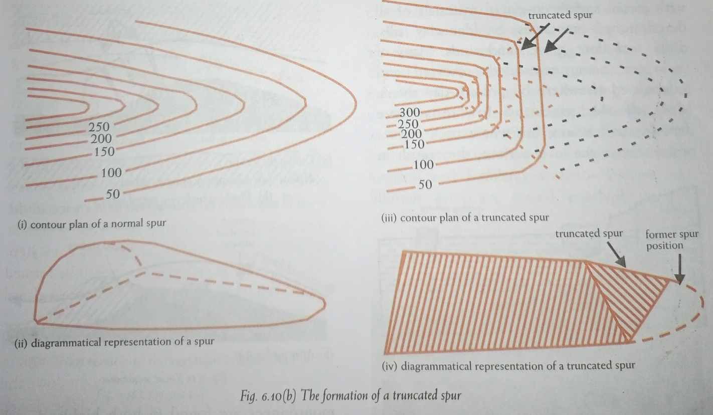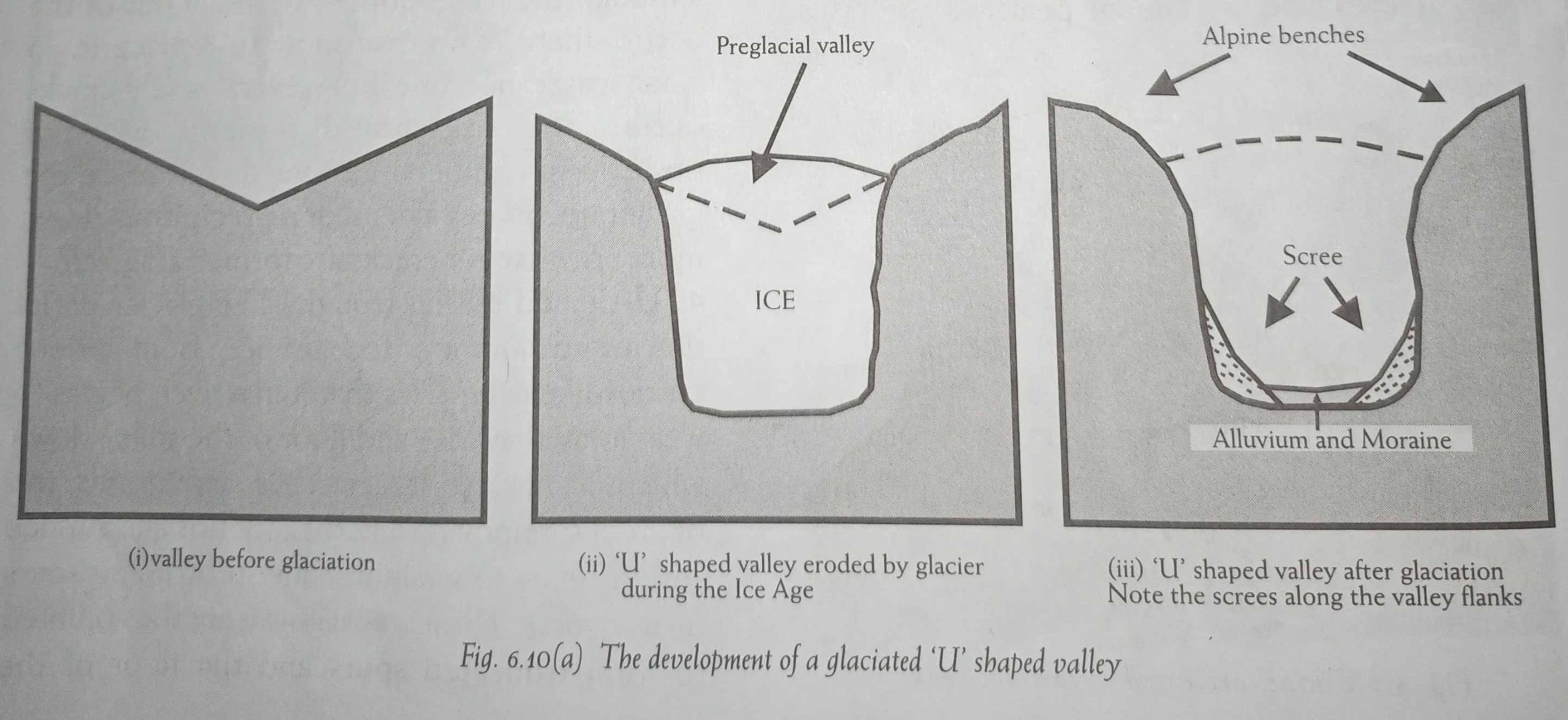 4) U-shaped glacial trough: The glacier on its downward journey, fed by ice from several corries-like tributaries that join a river, begins to wear away the sides and floor of the valley down which it moves. It scratches and grinds the bedrocks, removing any rock debris and surface soil. It tends to straighten any protruding spurs on its course. The interlocking spurs are thus blunted to form truncated spurs and the floor of the valley is deepened.