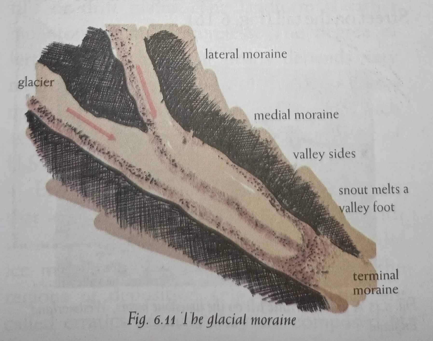 7) Moraines: Moraines are made up of the pieces of rock that are shattered by frost action, embedded in the glaciers and brought down the valley. Those that fall on the sides of the glacier, mainly screes, form lateral moraines. When two glaciers converge, their inside lateral moraines unite to form a medial moraine. The rock fragments which are dragged along beneath the frozen ice are dropped when the glacier melts and spreads across the floor of the valley as ground moraine. The glacier eventually melts on reaching the foot of the valleys, and the pile of transported materials is left behind at the snout in the terminal moraines or end moraine.