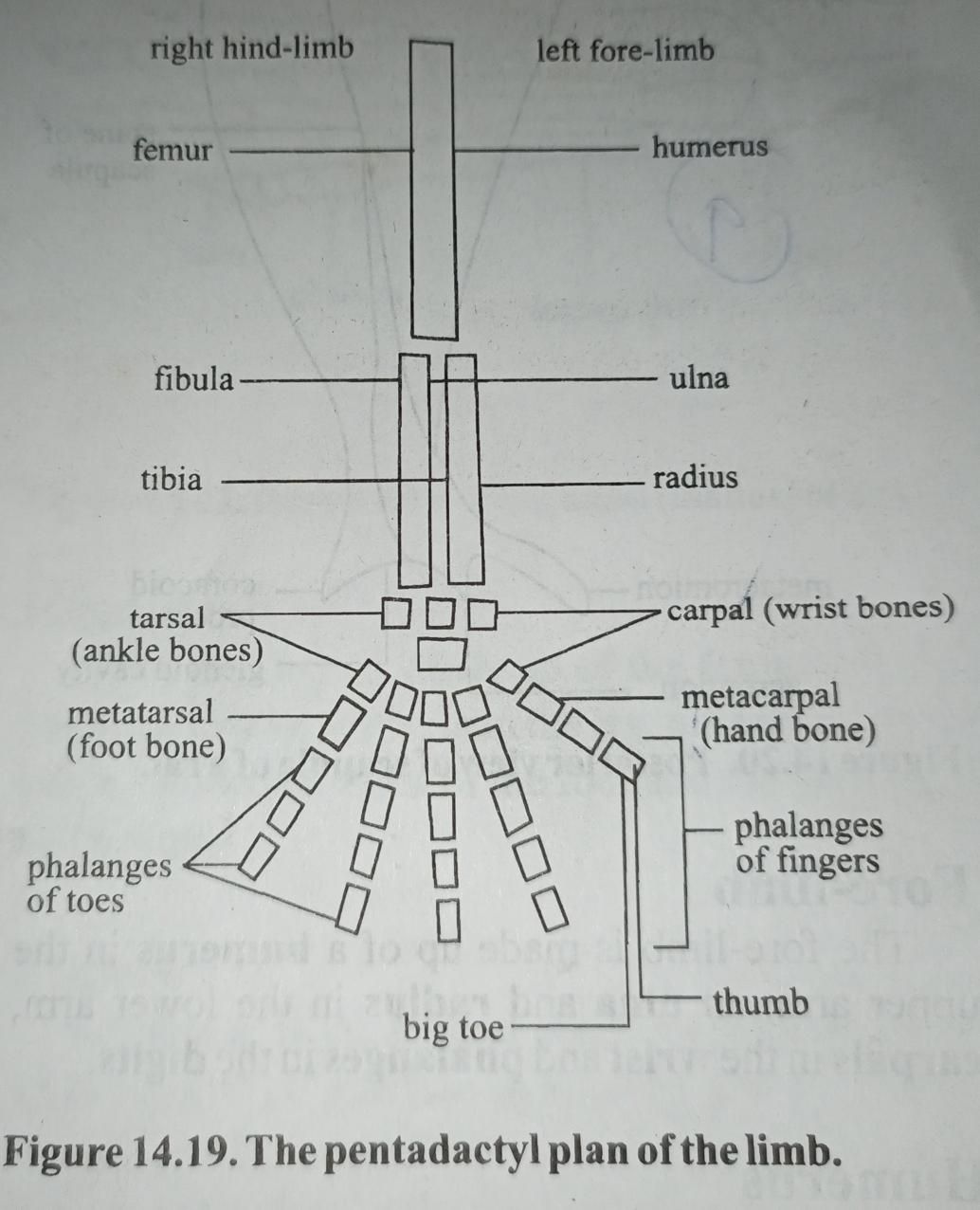 The fore-limb is made up of a humerus in the upper arm, an ulna and radius in the lower arm, carpals in the wrist and phalanges in the digits.