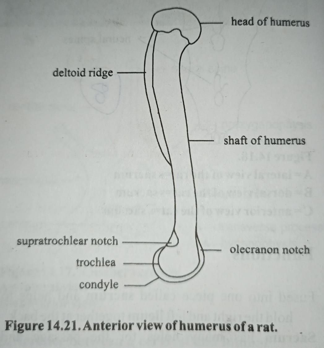 The humerus has a shaft and two extremities. The proximal end consists of a rounded head without a neck. The greater tuberosity lies at the opposite side of the head while the lesser tuberosity is attached below the head. The flattened area from the head midway the shaft is the deltoid ridge. A bicipital groove lies in between the head and the greater tuberosity.