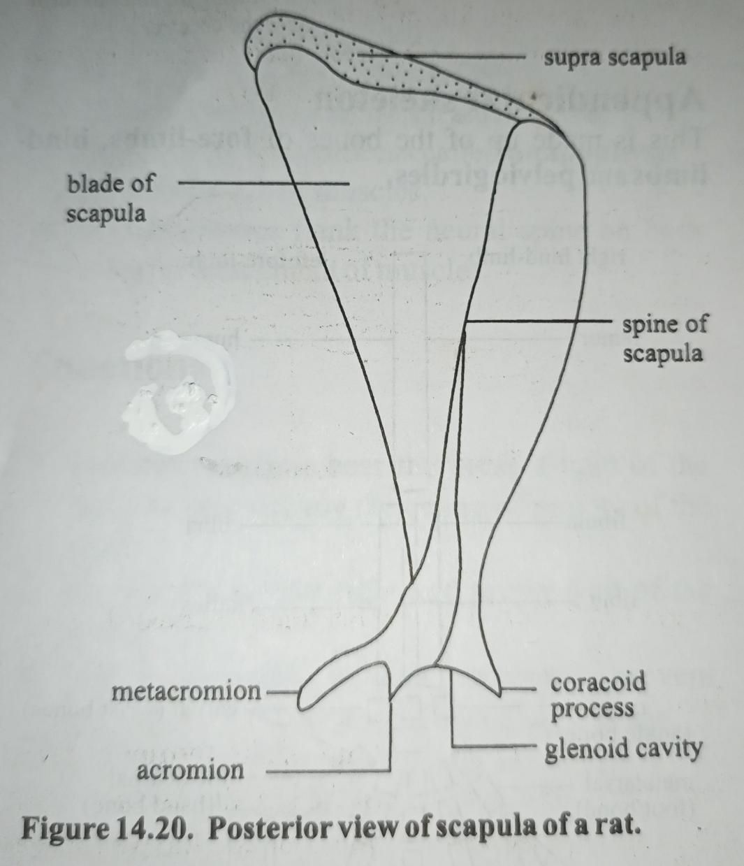 Scapula is a flat bone. It has one head-like end with two processes, the coracoid and acromion with a deep notch called the glenoid fossa or cavity. The rounded head of humerus fits into the glenoid cavity in a ball and socket joint. Another bone of the girdle is the collar bone or clavicle which glides over shoulder joint to keep the bones in correct position.