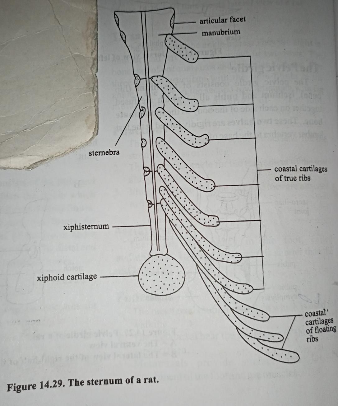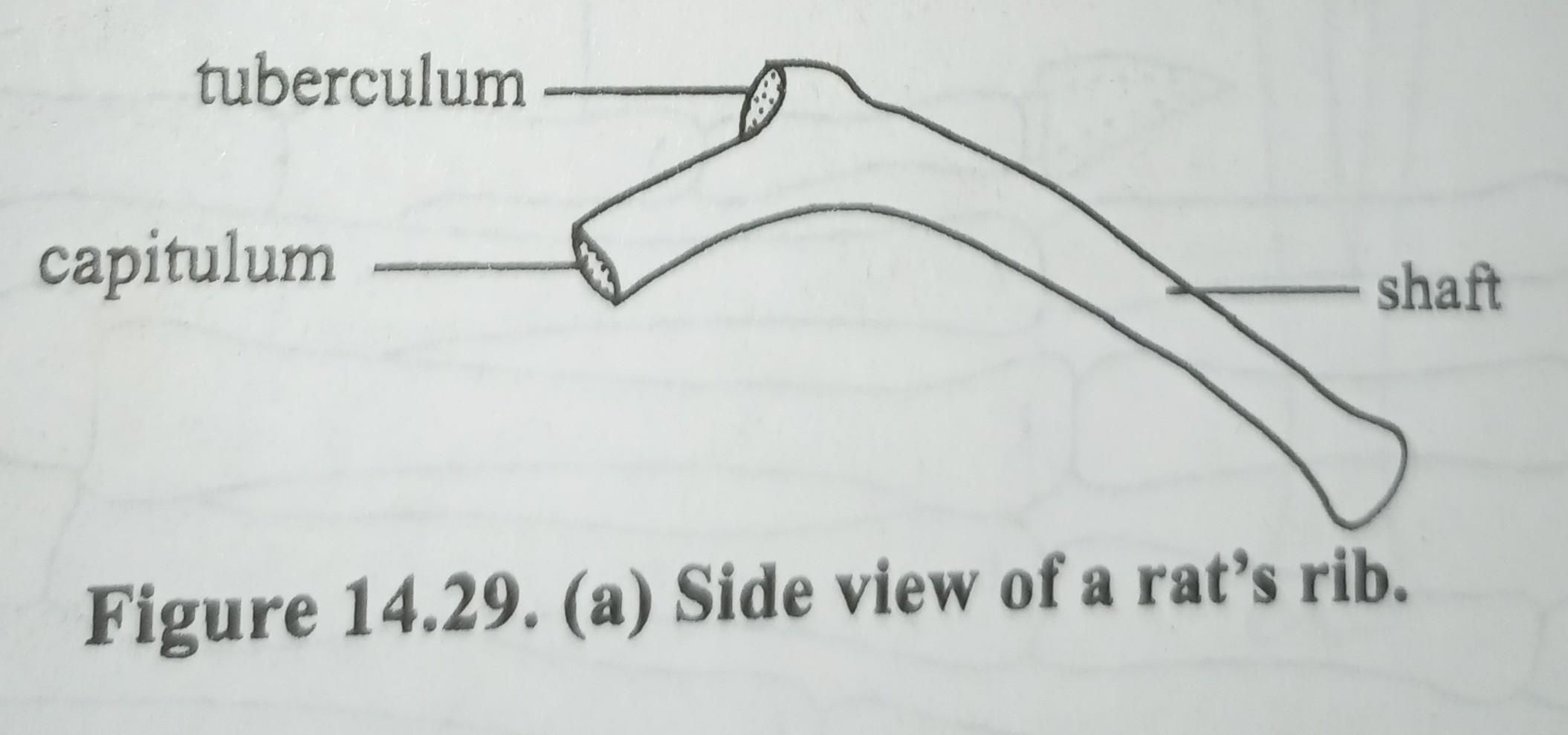 There are thirteen pairs of ribs in a rat. The first seven pairs of ribs are attached to the sternum and they are called true ribs. The eighth, ninth, tenth pairs of ribs have their coastal cartilages attached to the seventh pair of ribs. The eighth, ninth and tenth are therefore called false ribs. The last three pairs are attached only to the thoracic vertebrae. They are therefore called floating ribs. Each rib consists of a slightly curved shaft. The dorsal end of the shaft is the Capitulum and head. A little behind the capitulum is a tuberculum The capitulum articulates with the demi-facet of the centrum of the thoracic vertebra while the tuberculum articulates with the transverse process of the thoracic vertebra.