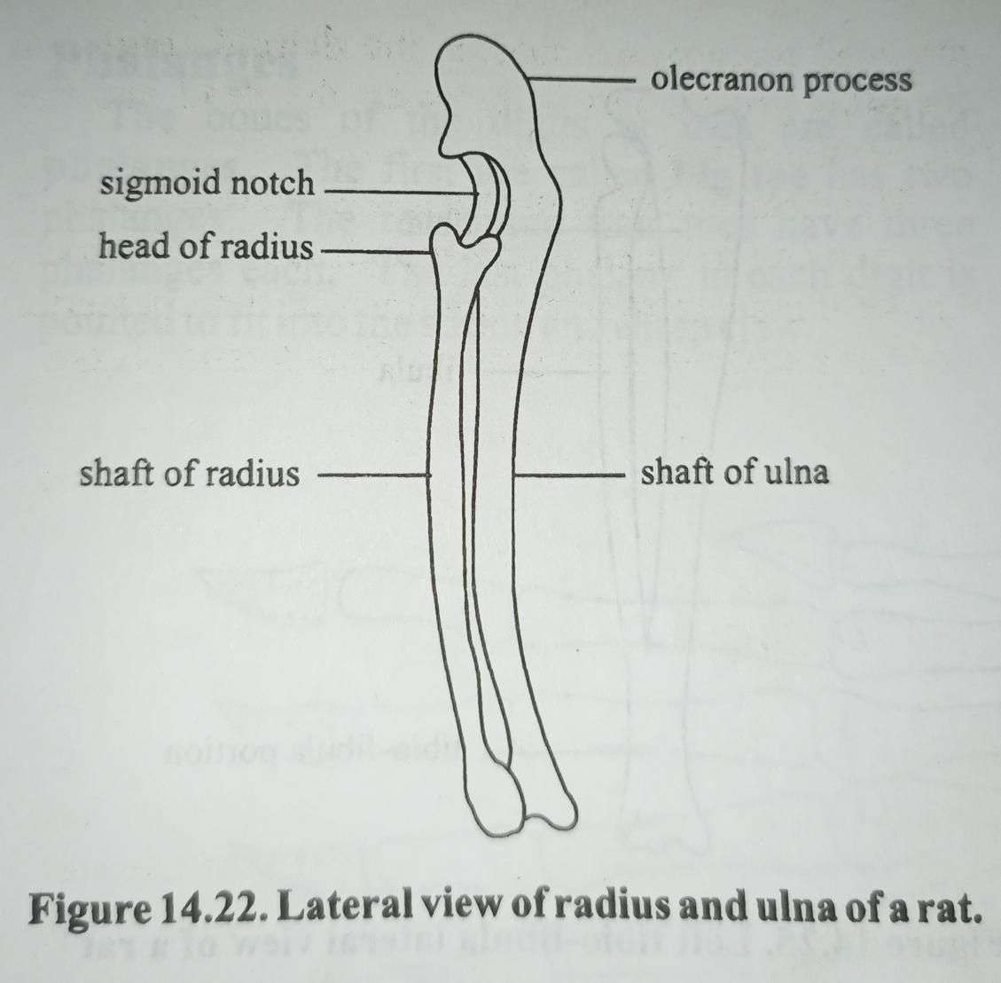 The two bones in the lower arm are the radius and ulna. The radius is shorter and it lies on top of the ulna. They both form the sigmoid notch into which the trochlea of humerus fits in the elbow joint. The ulna projects behind to form the olecranon fossa of humerus to keep the joint in position. The distal ends of radius and ulna form the styloid process at the wrist joint.