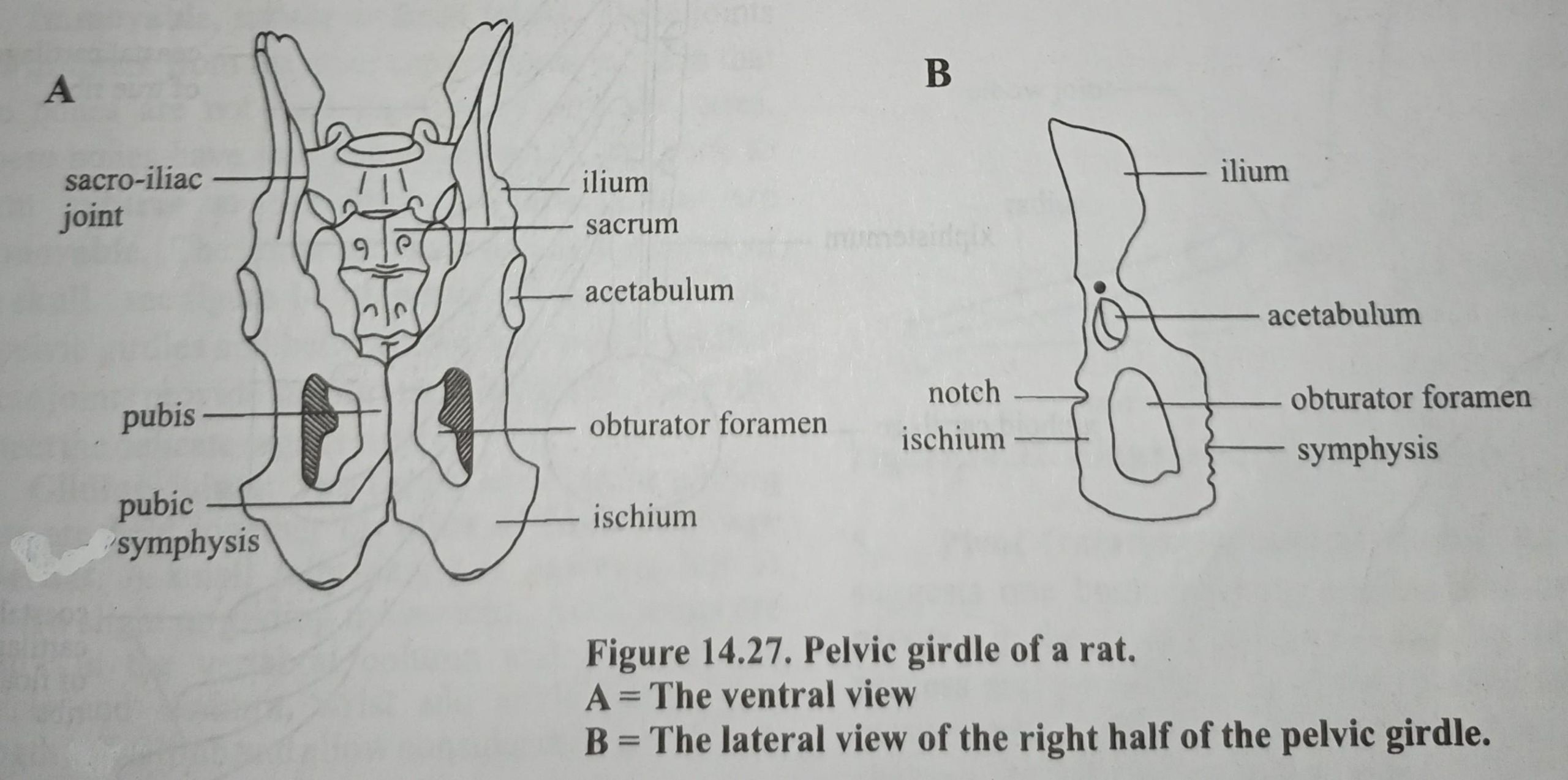 The pelvic girdle consists of the ilium (hip bone), ischium and pubis all of which are fused together on each side of the body as the innominate bone. These two halves are rigidly joined at the last lumbar vertebra to the base of the spine at the back while in the front they are less rigidly joined at the pubis by the fibro-cartilage of pubis symphysis. The distal ends of these bones form a cavity called acetabulum into which the head of femur fits to form the ball and socket hip joint.